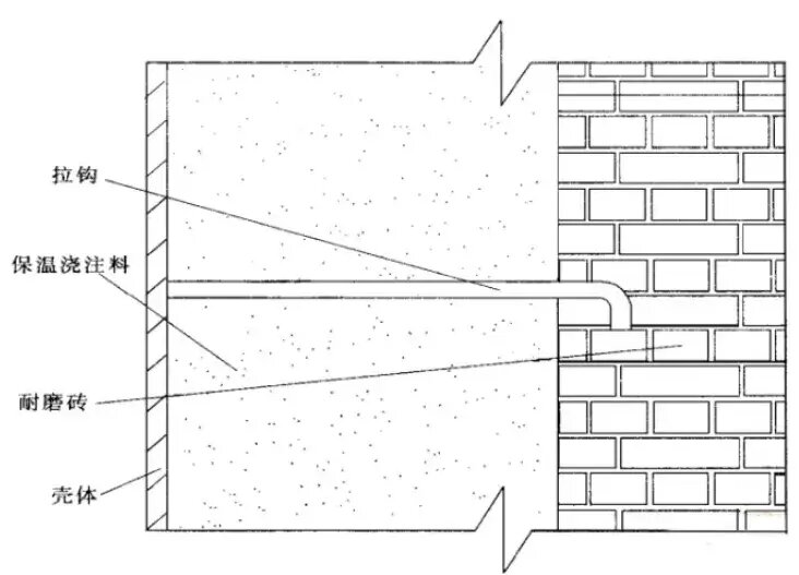 如圖5所示,為耐磨磚十保溫澆注料形式,同樣為解決膨脹每一定間隔留有膨脹縫,即耐磨磚與耐磨磚之間留有2mm的灰漿縫,耐磨磚上有用于拉鉤固定的凹槽,而且為了把耐磨磚的質(zhì)量分層傳遞到鋼殼上,并在適當(dāng)高度設(shè)有高溫?zé)釓?qiáng)鋼制的托架。這種形式適合于鋼殼形狀較復(fù)雜及其他不適合保溫磚的部位。