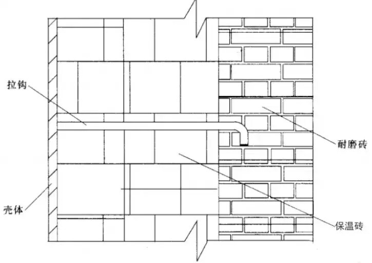 如圖4所示,為耐磨磚襯里+保溫磚型式,為解決膨脹每一定間隔留有膨脹縫,即耐磨磚與耐磨磚之間留有2mm的灰漿縫,耐磨磚分層采用焊在鋼殼上的拉鉤加固,而且為了把耐磨磚的質(zhì)量分層傳遞到鋼殼上,并在適當(dāng)高度設(shè)有高溫?zé)釓?qiáng)鋼制的托架。這種型式適合大面積平面或圓弧面。