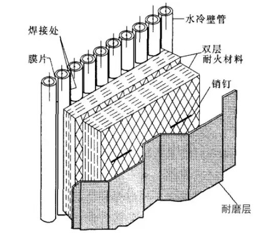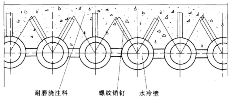 如圖1所示,為循環(huán)流化床鍋爐燃燒室下部水冷壁管上耐磨澆注料的施工工藝,耐磨材料是由焊在管子表面上的金屬銷釘固定。由于該區(qū)域?yàn)槿紵蚁虏棵芟鄥^(qū),其物料濃度很高,混合及湍流流動(dòng)非常強(qiáng)烈,所以磨損非常嚴(yán)重。為了防磨,在下部密相區(qū)襯有一定厚度的耐火、耐磨澆注料。