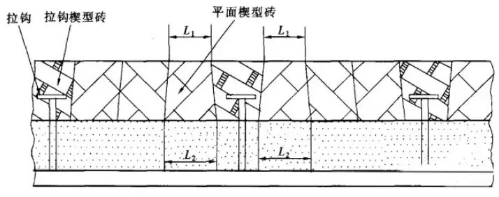 如圖8所示,為拉鉤楔形磚結(jié)構(gòu)形式,是利用楔形拉鉤磚的角度,使兩塊楔形拉鉤磚之間的平面楔形磚的L1均小于L2,使其脫出困難,可確保運(yùn)行的。主要用在分離器的圓筒部分及錐段部分。