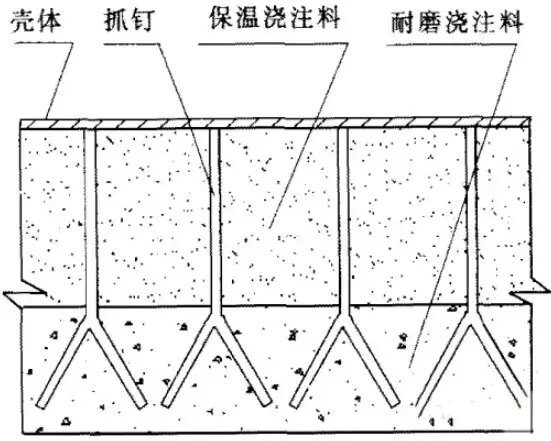 如圖3所示,為耐磨澆注料+保溫澆注料型式,這種結(jié)構(gòu)型式是按一定規(guī)律布置“Y”形抓釘用以固定耐磨襯里,為解決金屬抓釘與耐磨澆注料之間的溫脹差異,抓釘上要涂1mm厚浙青,避免熱態(tài)下由于金屬銷釘與耐火材料的膨脹不同而引起耐火材料的開(kāi)裂,同時(shí)耐磨澆注料需按2%的比例加入不銹鋼纖維,同樣耐磨襯里要留有適當(dāng)膨脹縫。