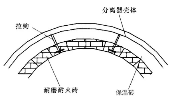 如圖7所示,為分層拉鉤磚結(jié)構(gòu)形式,在分離器的圓筒部分及錐段部分均采取楔形耐磨磚與拉鉤磚配合的這種結(jié)構(gòu),可有效防止耐磨耐火磚的脫落,使任何一塊獨(dú)立的耐磨耐火磚幾乎沒(méi)有可能脫落。