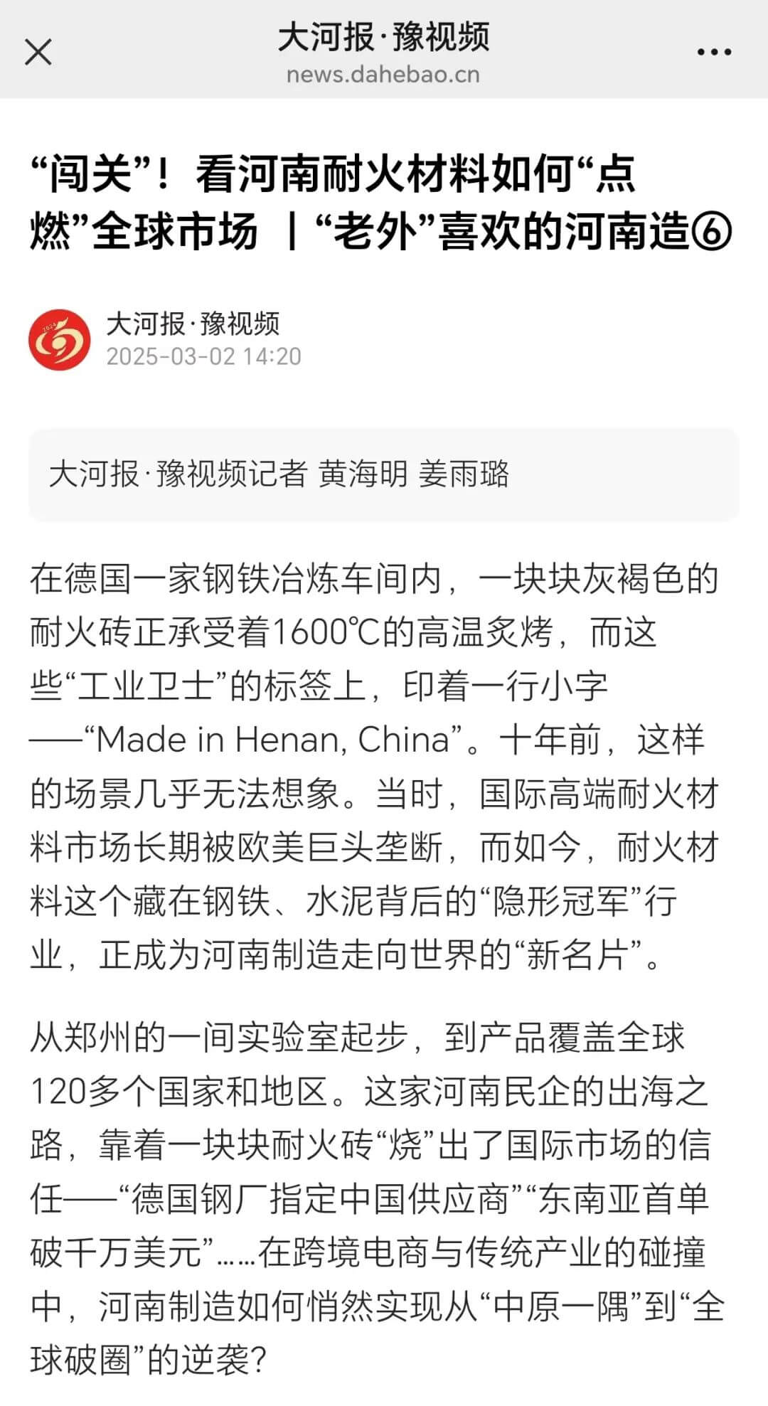 從鄭州的一間實(shí)驗(yàn)室起步,到產(chǎn)品覆蓋全球120多個(gè)和地區(qū)。這家河南民企的出海之路,靠著一塊塊耐火磚“燒”出了國際市場的信任——“東南亞首單破千萬美元”……在跨境電商與傳統(tǒng)產(chǎn)業(yè)的碰撞中,河南制造如何悄然實(shí)現(xiàn)從“中原一隅”到“全球破圈”的逆襲?